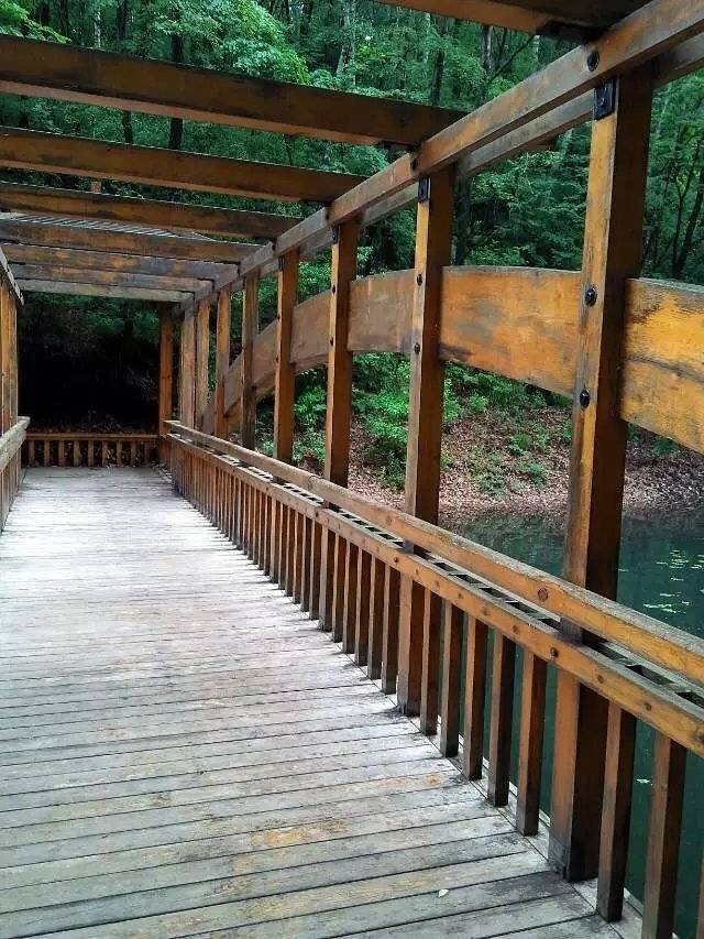 从停车场下车有一个向上走的坡路,上来之后东北方向(就是你的右上角方向)有一个仿古建筑的山门,这就是三角龙湾的大门,旁边就是售票处。进了山门走大概200米,左手边有一个向下的木栈道,沿着台阶往下走。你左手边第一个景点叫【水晶宫】,沿着洞口进去,里面供奉的龙王爷,可以上香的。从水晶宫出来你会看到一个拱形的门,下面是台阶。这个地方叫【拐子阶】,据说赵本山和范伟当初排演卖拐就是在这个地方。沿着台阶下去,向左拐走下坡路。不远处,你会看到右手边一块石头上写着“三角龙湾”四个大字,这是龙湾的【最佳观景点】,可以在这里拍照哦。然后就来到岸边。左手边是WC,右手边就是岸边了,一直往前走有个向上走的台阶,通往【通天亭】,有的人说是一共有468级台阶,有的人说是有488级台阶。我爬过几次,但是数着数着就忘记多少了。上面可以俯瞰三角龙湾的全景。我去年去的时候,由于年久失修,上面的木板已经开始松动了,今年据说正在整修。腿脚不好的不要轻易尝试,还是挺累的。