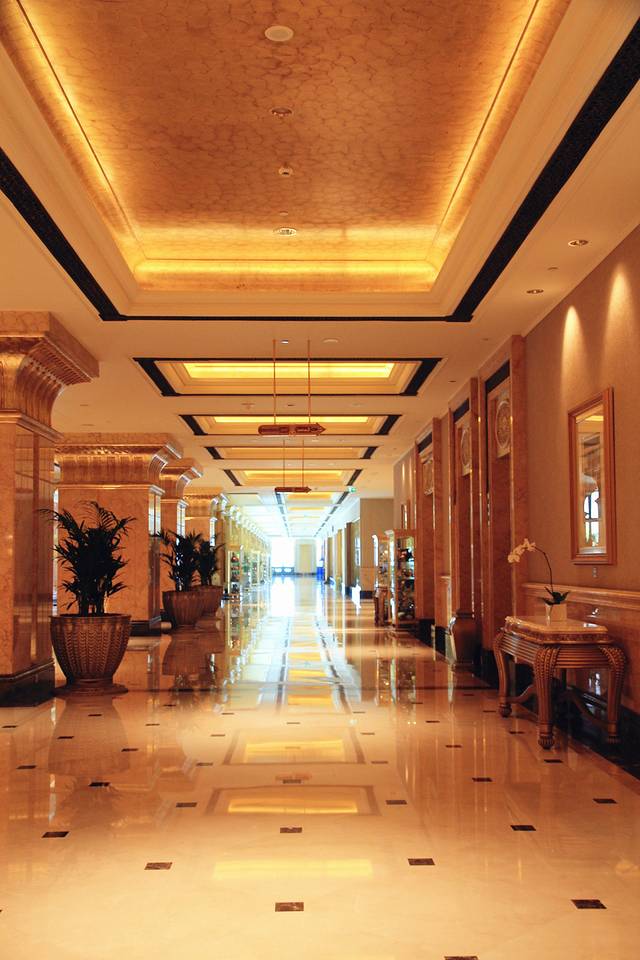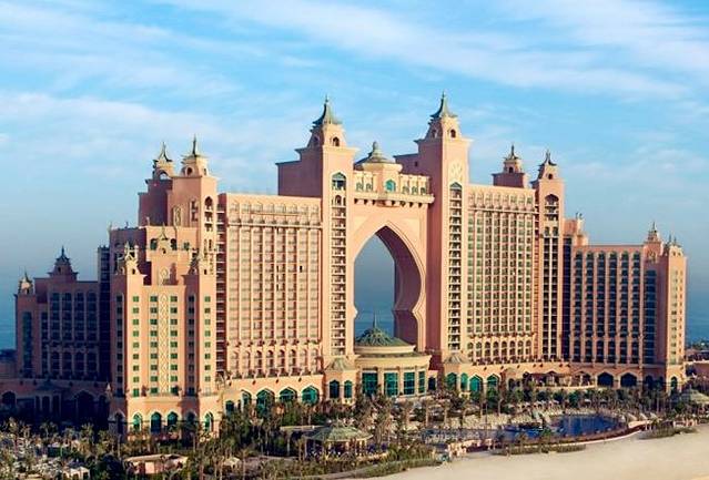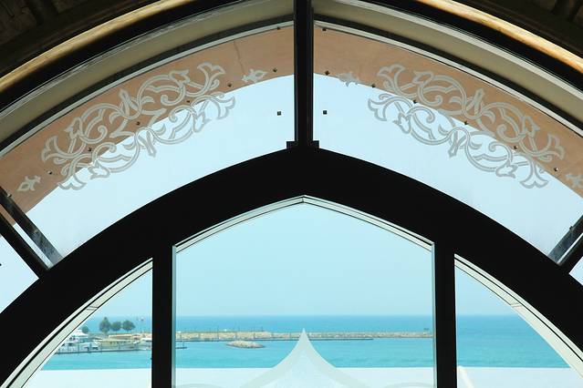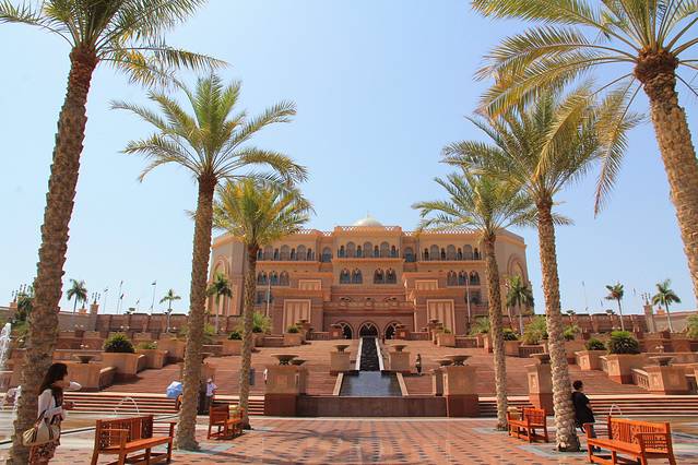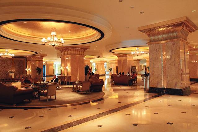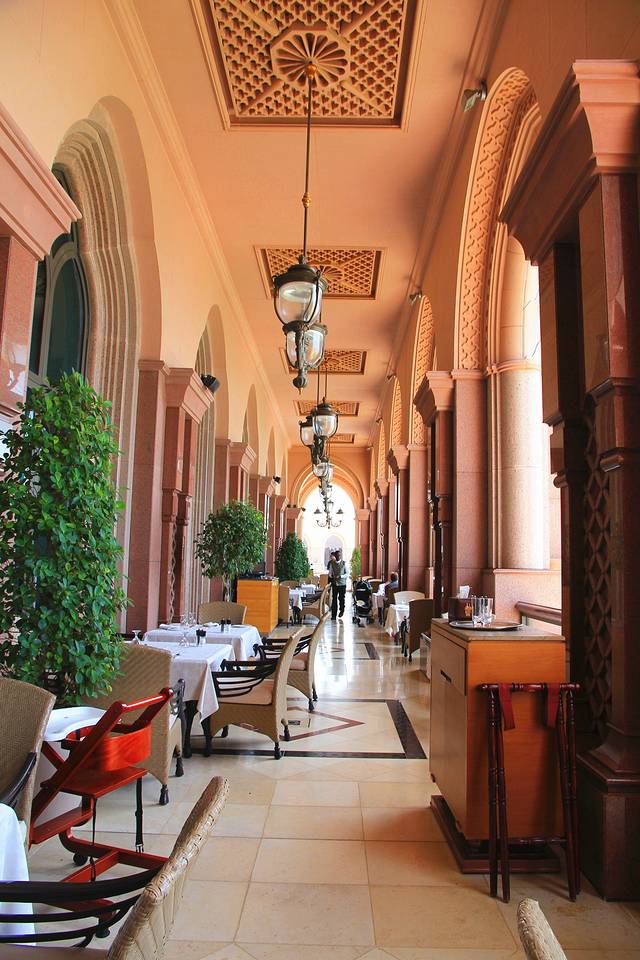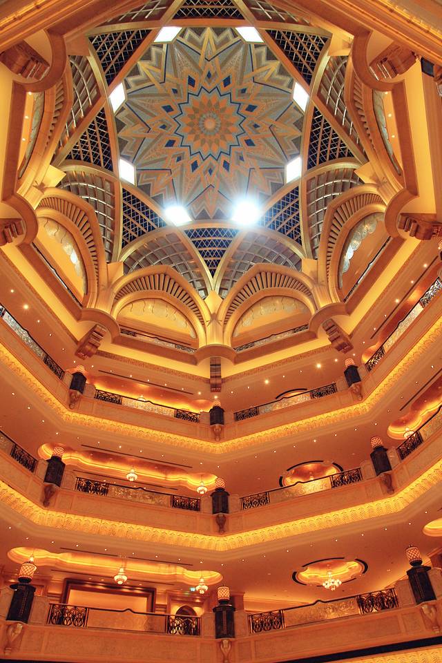 天的午餐选在世界上唯一的一家八星级酒店阿布扎比皇宫酒店。皇宫酒店(Emirates Palace) 位于阿布扎比的海岸边,由英国名师约翰.艾利奥特设计,酋长国斥资30亿美元建造,是迄今为止世界上最为奢华、最为昂贵的酒店。