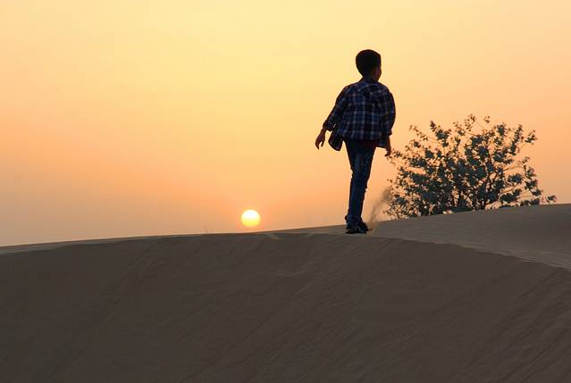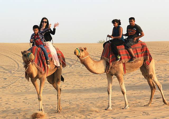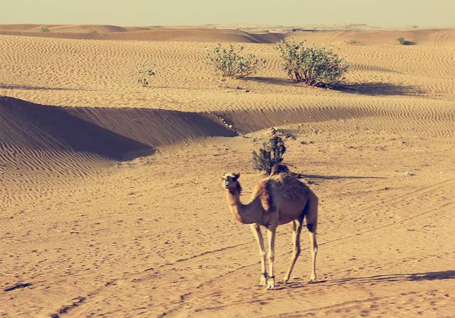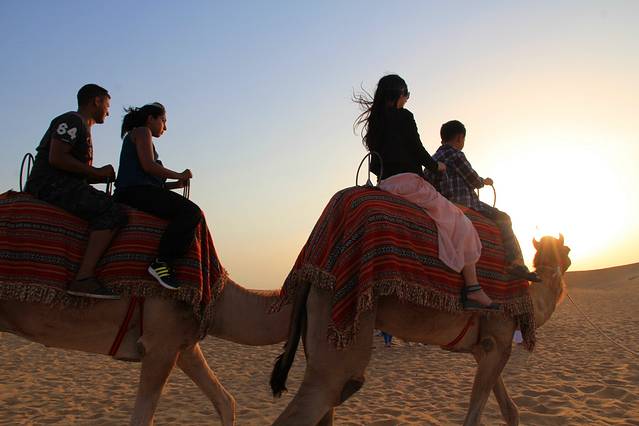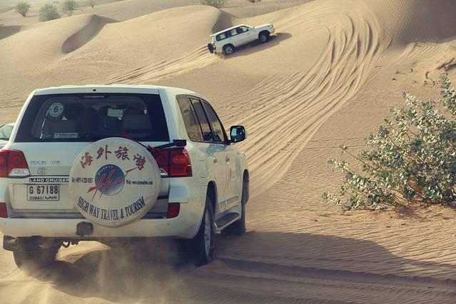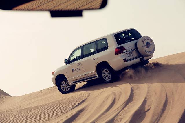 逛了大半天的时尚购物中心,太阳的威力渐渐柔和,预定好的四驱陆巡已经早早停在Dubai Mall的停车场里了,接近傍晚的时分我们向沙漠启程,开始属于冒险者钟爱的的沙漠冲沙游戏。沙漠冲沙是Dubai的传统旅游项目,开着V8的陆地巡洋舰在大漠中任意驰骋,在温暖的落日余晖中骑着骆驼缓缓迎向夕阳,在充满中东风情的歌舞中享用阿拉伯烤肉,这才是是阿拉伯民族粗犷淳朴的原驻生活吧。