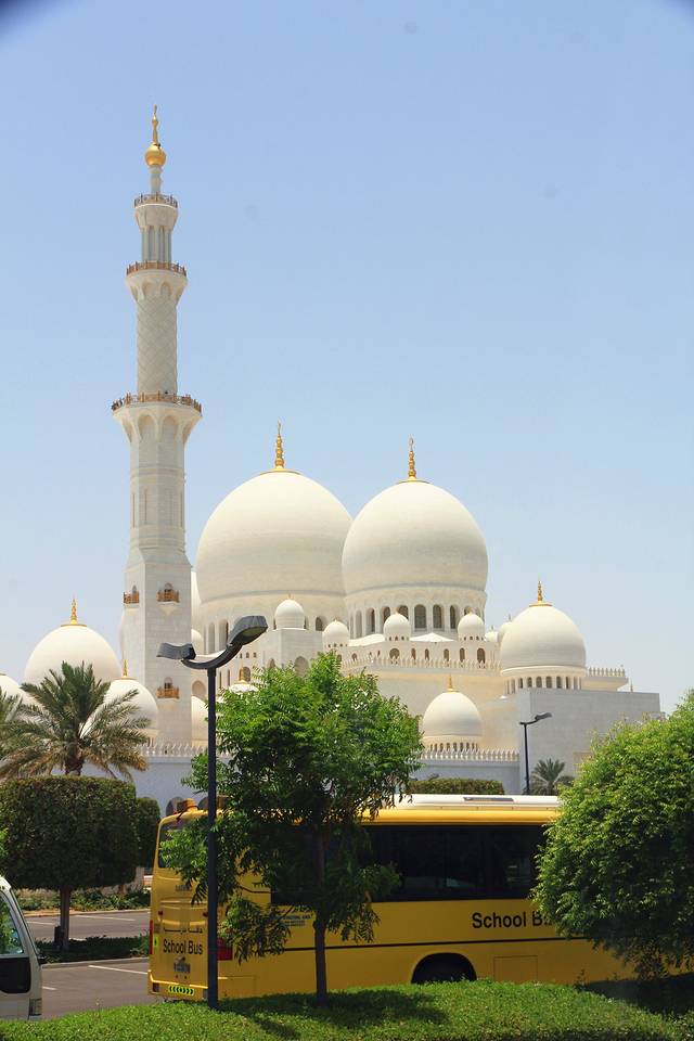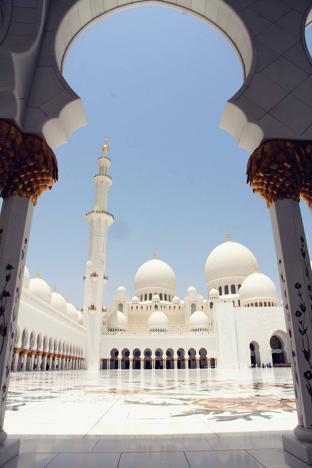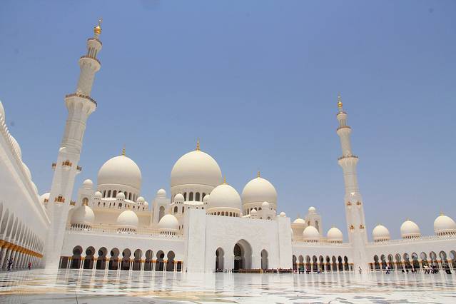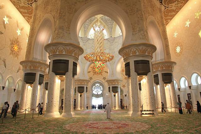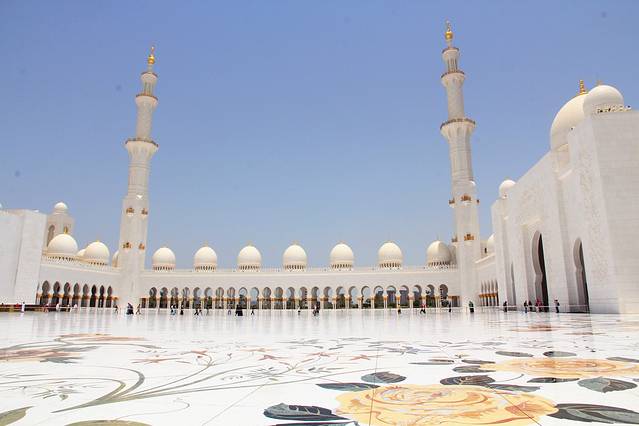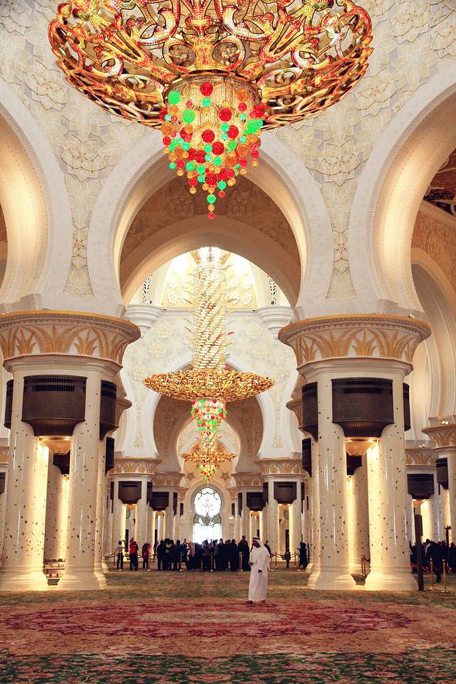 到了阿布扎比,必定要去看的一定是谢赫扎伊德清真寺。这个全球第三大却最奢华的清真寺闻名于它的希腊汉白玉大理石和46吨黄金、它的价值580万美元的纯手工编织的世界上最大的地毯、以及它的每盏价值80万美元的施华洛世奇水晶吊灯。