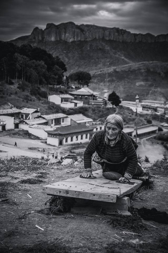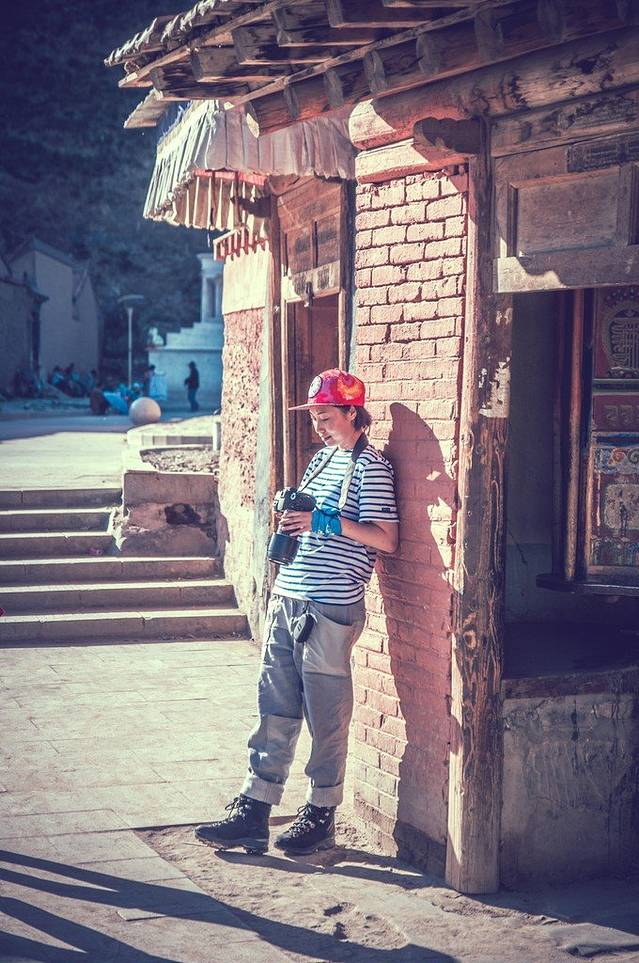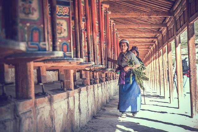 在转经廊等待日落前去登晒佛台,也在等待一些有特色的转经人