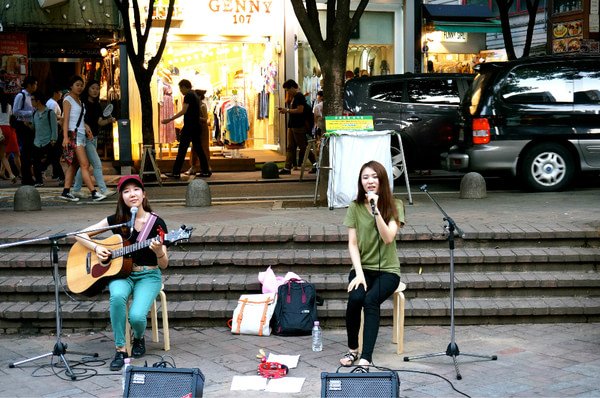 街边的公演自然不用多说,也是到这里的年轻人很喜欢的一种表达自我的方式,弘益大学是韩国数一数二的艺术类大学,所以街边的公演当然也是相比较其他大学来说,更加的人才聚集,而且年轻人更多