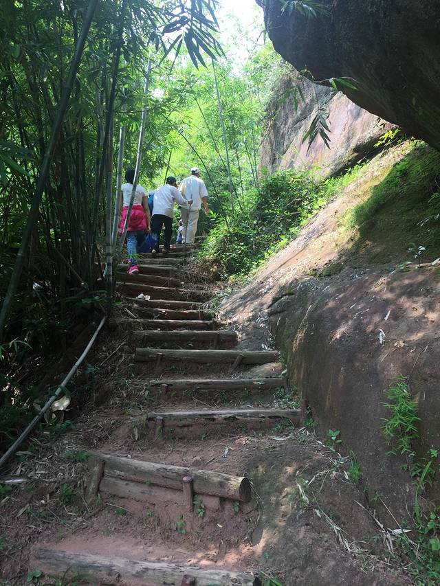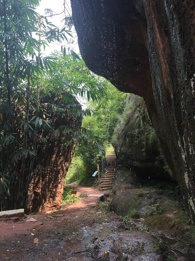 开始登山,很快就走进了林荫郁闭的山谷。步道有的是原木垒土建成,原木上长着各种颜色的菌子,有黄的、白的、还有黑的、条纹的。也有的路段是在丹霞岩原石上凿出来的,从一块石头上直接走上去的感觉很奇怪。