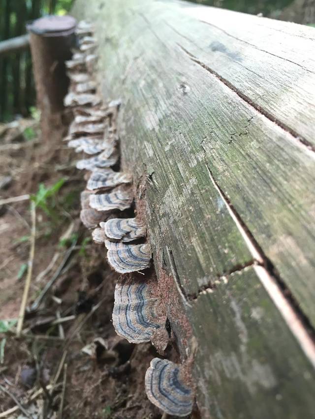 在景区买票后,搭乘环保车进入景区,穿过一个小山谷,周边有很多荔枝树,据说最古老的树龄有几百岁了。大约几分钟的车程,来到山口转运站。旁边有条小路通向果园里的洗手间,洗手间用木头装饰,通风透气。木头上长了好多百色的小菌子,比画还好看,又鲜活。