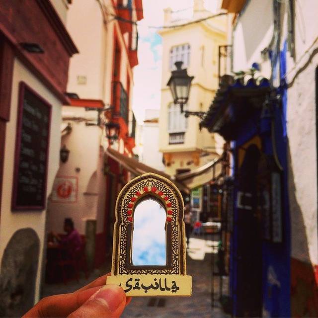 塞维利亚(Seville)的圣十字区其实宽窄巷子错综复杂交叉,作为初来乍到的游客虽然常迷路,但也带来了好处,迷失在这片老城区可以有很多惊喜,比如我在某条小巷子的一家纪念品店淘到了这个我很喜欢的纪念品,一个用阿拉伯文写着Sevilla(西语的Seville)的特有西班牙南部风情的冰箱贴还是小镜子。