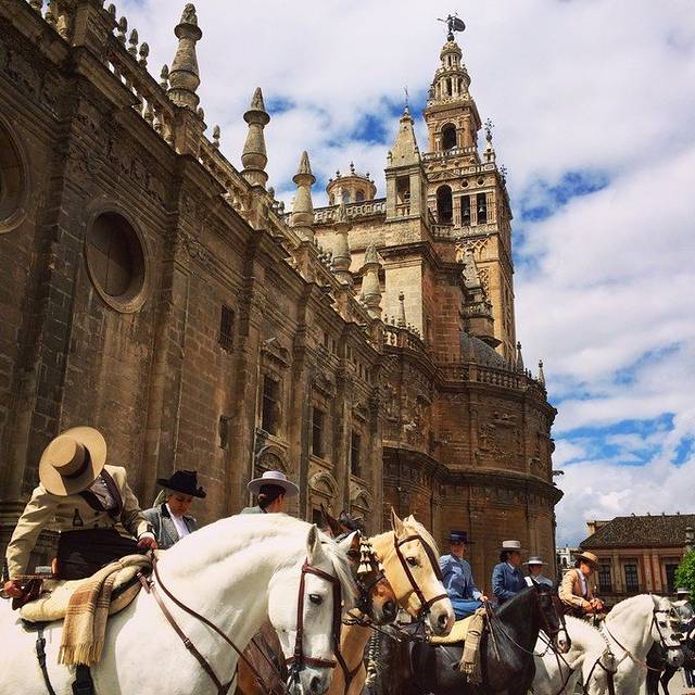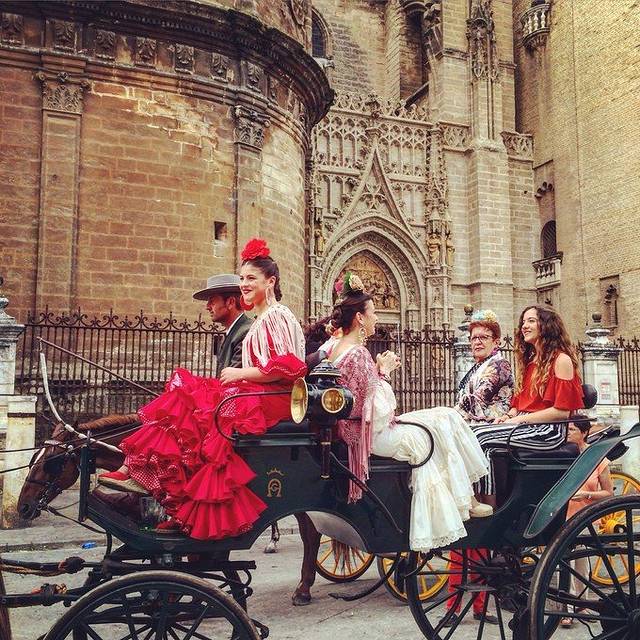 大道柏油马路上的一马车上坐着,已经盛装前往四月展会(Feria de Abril)的一家子。女人们都穿着传统安达卢西亚的服饰,男人们都穿着正装,我一下子晃眼了,觉得自己像是穿越到中世纪的西班牙南部街头。等红灯都那么不真实,耶稣基督。
