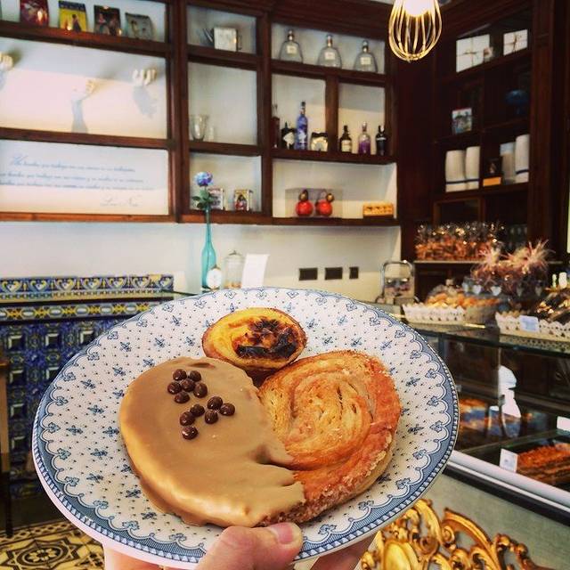 对刚来那天吃到惊艳味蕾的法式糕点店(叫Manu Jara)念念不忘,今天要离开塞维利亚(Seville),给自己找了个冠冕堂皇的好借口,又回去赏心悦目地吃个早餐。点了半边裹了榛仁朱古力酱幼滑入口即溶的蝴蝶酥,和葡挞,当然还有一杯咖啡。