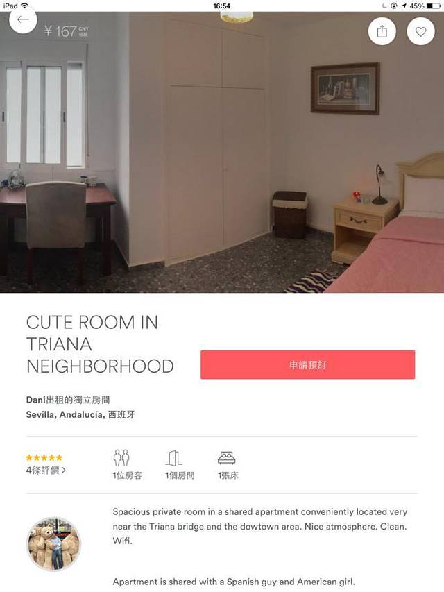 因为四月展会(Feria de Abril)的缘故,我找不到沙发客也没有剩余的青旅床位,这样艰苦的条件下,我咬了咬牙关找了比较贵一点的Airbnb。