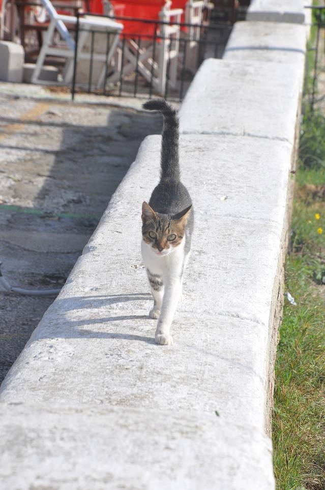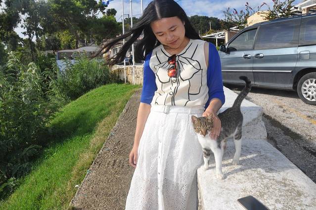 Assos不愧是凯岛最美小镇。小镇其实就是两座小山的一块陆地,隔断了两个海峡,从盘山公路上往下看简直美爆了。一边是如同矢车菊一样深蓝的大海,一边是浅盈盈的透明海水,偶尔有小猫从海边缓缓走过,生个懒腰,晒晒太阳,宁静、祥和,又如此灵动、活泼。流连于此,真的有种世外桃源的感觉。