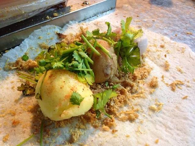 蚵蛋包——作法略复杂,需将绞肉、高丽菜、韭菜、冬粉、红萝卜等原料拌匀,加入胡椒粉、盐、香油、五香粉等调味料腌制入味,馅料与韭菜盒、胡椒饼、水煎包类似。接着将面皮放进模子里,填入腌制过的馅料、鲜蚵,打一颗鸡蛋,再像捏小笼包一样,用双手并用将面皮袋口捏紧,随即丢进热锅油炸。