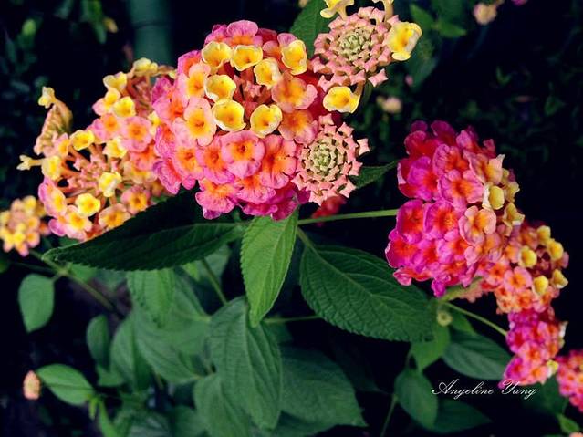 不知道什么花,从黄色、橙色、粉红色到枚红色,一团一团的特别漂亮