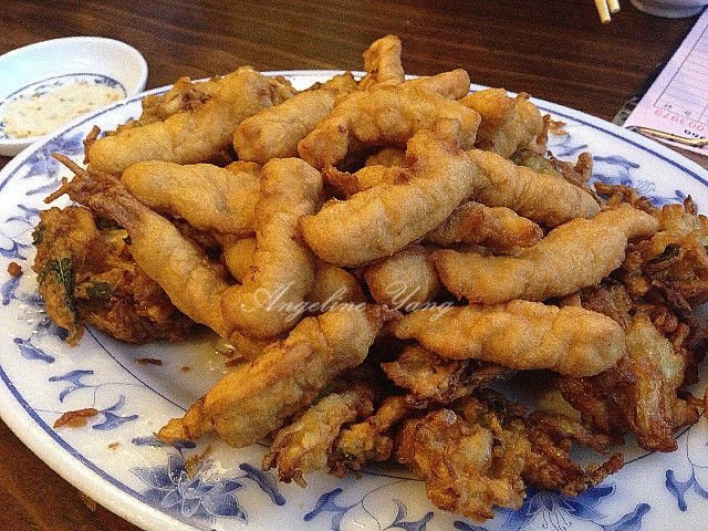 味珍香卜肉,最老牌哦,猪里肌肉除去筋以及油脂的部份,切成条状,沾上佐料以及面糊入锅油炸而成,以胡椒盐沾食。炸蔬菜也一样好吃,脆脆的,最主要的是不用担心地沟油。