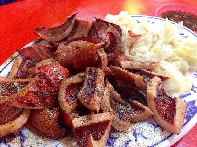 油炸的,干煸的,烧烤的,nonono,都不是哦,庙口红糟鱿鱼,第一次,很难形容它的口味,甜甜咸咸的再配上酸酸脆脆的泡菜和甜辣酱 ,很妙!