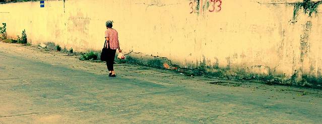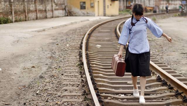 铁轨边上一位姑奶迈着年老的步伐缓缓走过,是这样的孤单的画面