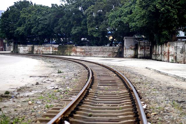 石围塘火车站牌坊入口的铁轨,这里靠近江边平时很少人