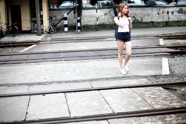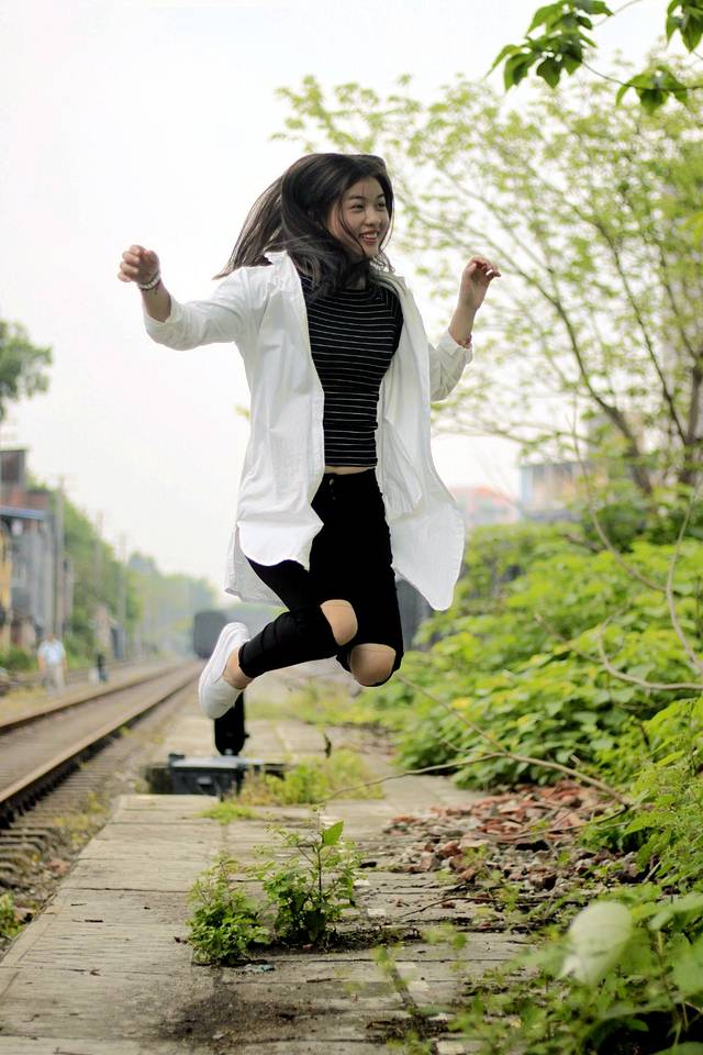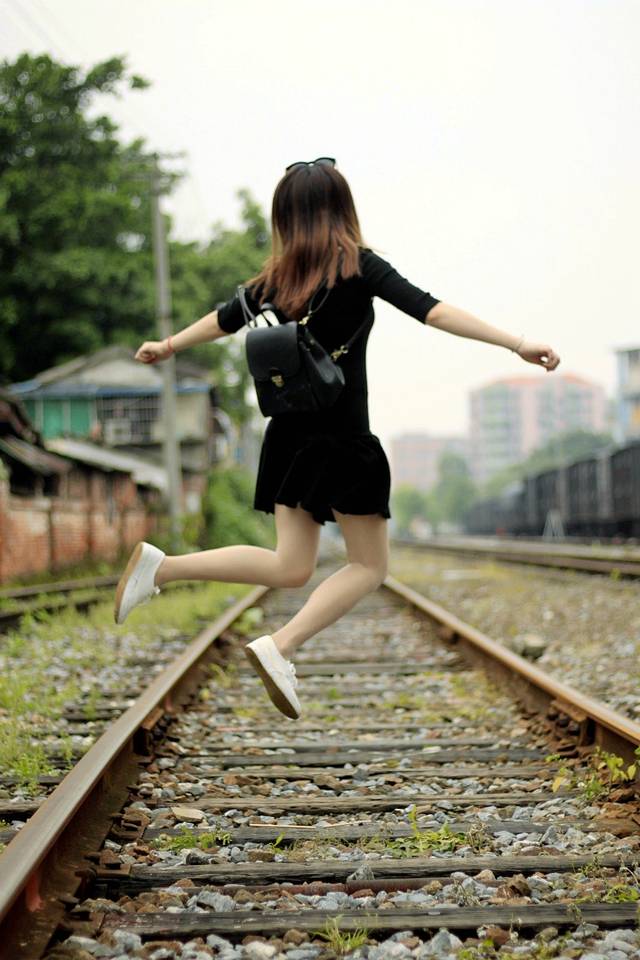 拍这一组动作的时候我没过份要求模特要什么跳才好看,只是叮嘱别走光,铁轨上碎古多,安全为主