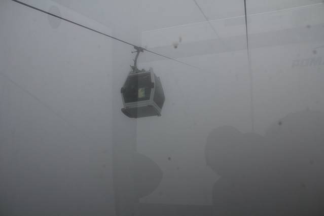 上第二部分的索道温度降的很快,都冷了!挺冷那种。 都是封闭的车厢了!这要不封闭,老帅了………………!!!都在云里! 要是晴天就能看清楚,但没了这种感觉,上面风还大,给车厢都吹的忽闪忽闪的~挺怕怕呢……