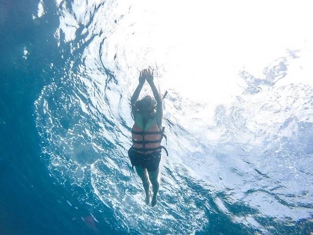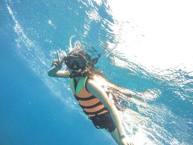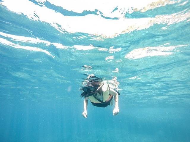 不会游泳的人不用烦恼的,可以尝试浮潜,穿上救生衣,把着救生圈,教练会陪着你去看海底世界的。我会游泳,所以戴好面镜和呼吸管,就自个儿入水了。我真的得好好说说看到清晰的海底世界的第一印象!