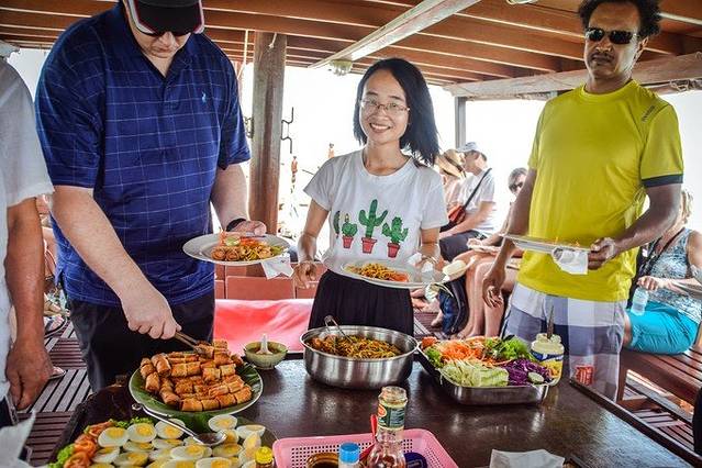 这不是广告宣传,是因为体验真的很棒!船身很宽,所以一路上基本不晃,我都没晕船(当然上船他们有给需要的人一片晕船药),从查龙码头到小皇帝岛2小时的航程,你可以在二层纵览海水线从蓝绿变成深蓝色,途中会供应新鲜的西瓜、菠萝,咖啡、冰饮、泡面随便拿,另外,会有专业教练指导深潜的注意事项,我虽然只尝试浮潜,但我还是凑近去仔细听了,多学习点总归不是坏事儿。