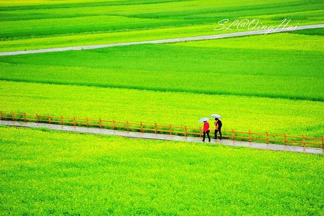 观花台景区,就是在一个小山上可以看到周围一望无际的油菜花的全貌,但阴雨一直伴随着我们,上到了山上,能见度依然不高,但周围无边的油菜花海,真的是会让人痴迷,如果是晴天,这里一定又是另一番景象。