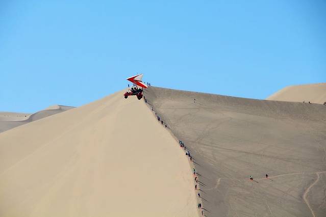 在沙漠里有几种娱乐玩法:骑骆驼、坐滑翔机和直升机。