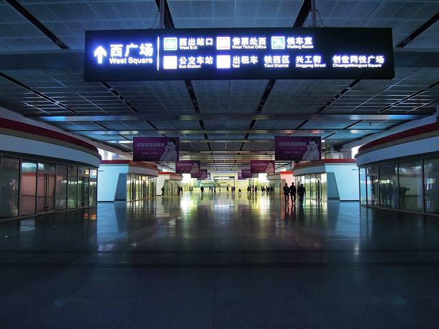 沈阳站欢迎您,出站口上面牌子有各班车次。不同方向的列车,终点是沈阳。