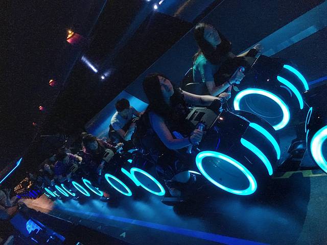 这是明日世界的极速光轮,我们也没去领FP,因为只要排30分钟就可以玩了。这是整个园区里最刺激的项目,摩托车式过山车,速度非常快。进去之后真的是非常超时空的感觉。