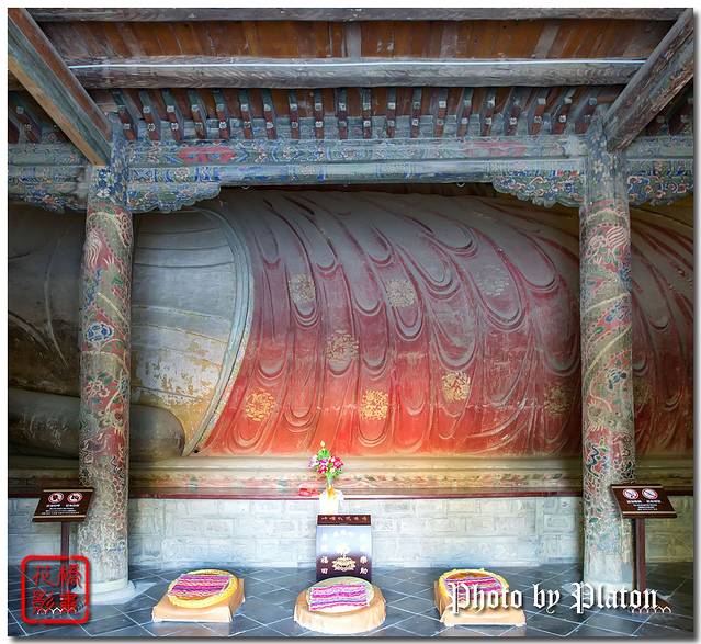 大佛殿殿高33米,面阔9间,规模宏大。殿门两侧各镶以六平方米的砖雕一块,左为“登极乐天”、“西方圣境”,右为“入三摩地”、“袛园演法”。殿内有木胎泥塑佛像,长34.5米,肩宽7.5米,脚长4米,耳长2米,金装彩绘,形态逼真,视之若醒,呼之则寐。卧佛身后塑十大弟子,两侧廊房塑十八罗汉,殿内四壁为《西游记》和《山海经》壁画。