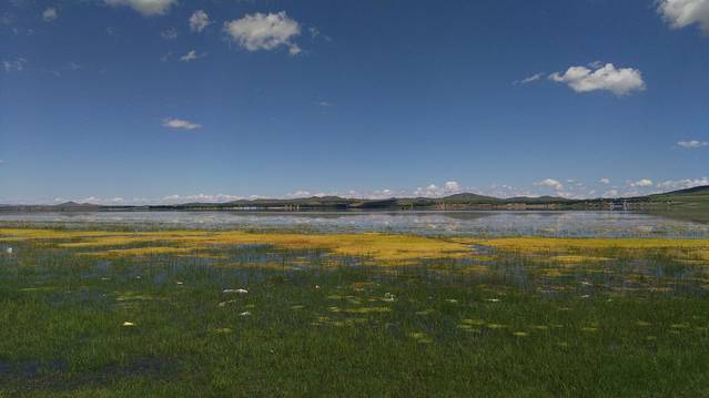 在景区附近一个不知名的小湖泊,蓝天白云衬托下的湖水与草场