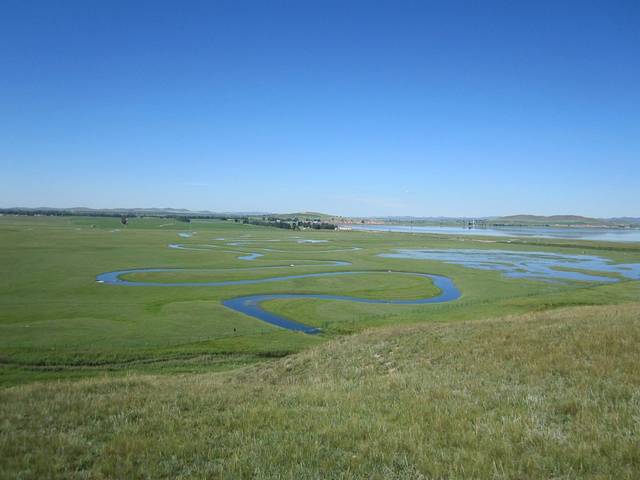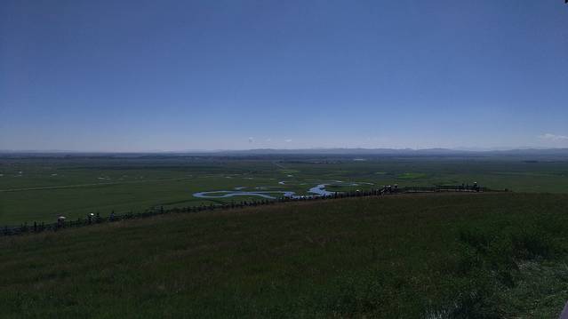 蓝天下,一望无尽的草场,蜿蜒曲折的河道与景区木栈道