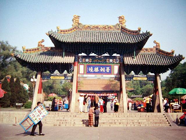 太原市,先去郊外著名的晋祠游览(40元),祠内古木参天、建筑古朴、游人众多,最具文物与观赏价值的是殿内的人物彩塑,但其中汇集了彩塑中的精品——侍女像的圣母殿却不让进入,说是保护文物,只能站在门外的栏杆旁远远眺望,光线昏暗根本看不仔细,太遗憾了!听说每个侍女像表情各异、姿态生动,艺术成就很高。我有受骗的感觉,花钱购票进来却看不到最想看的东西,真气人!(当年参观少林寺时也是不让入殿观赏“十八棍僧救唐王”的壁画)。