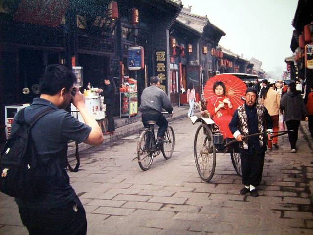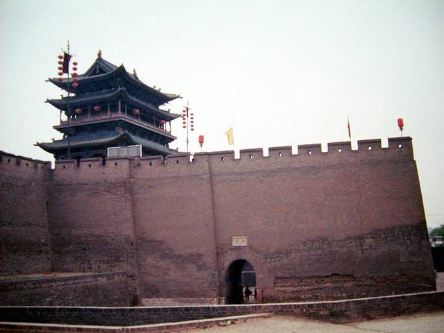 汽车去平遥古城,途中路过乔家大院(《大红灯笼高高挂》拍摄地,50元太贵不进)。我快走到平遥城门时,一名人力三轮车夫使劲游说我惠顾他的车,说进城要买门票,若坐他的车进去可以给我优惠。但我记得书上好像说是无需买门票的,而且我本来就喜欢徒步游,这样才能细细品味古城的风物。于是我坚定地向他摇头摆手,看到他不得不悻悻地离开,我就暗自乐了:哼!以为我年轻没经验、好欺骗,想得倒美!当我穿过城门时,发现连售票处都没有,悬着的心总算放下了。当日下午游览了城内最高古建筑——市楼所在的南北大街,晚上入住当地居民的四合院旅馆,简朴而干净(30元/普单间),大院内遍植花草树木,很有生活气息,是大家的公共活动地,这是山西大院最普遍的建筑特色,很注重环境的美化。