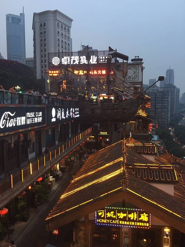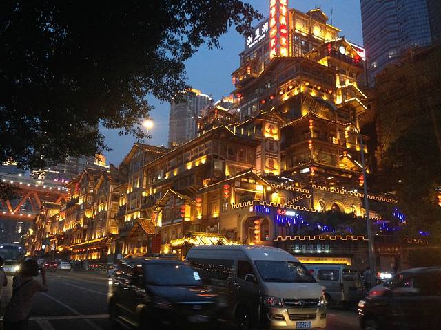 从长江索道到洪崖洞有点远,所以我们选择了打车,10块钱,到了洪崖洞11层,先看到的就是海盗船和跟阁楼很像的雕塑,这个我在之前的攻略里看到过。。虽然忘记了名字。。从11楼开始一点一点往下走,每层都是不同的东西,但是逛起来也没什么太大的意思,下到1层之后可以过马路,有个小型观景台,在这个观景台上可以看到洪崖洞全景,但是拍照好像还是在马路边比较好一些。晚上7点多我们开始找地方吃饭,4层是美食街,有卖很多好吃的,虽然知道贵,但是我们已经走不动了,有个小巷子里有一家九品粥,这家的酸辣粉超级好吃!很隐蔽,需要好好找,而且也没有店面,就是几个座位,选中这家也是因为我看到好多当地的老人在这里吃,那说明味道肯定正宗啊!果然很正,越辣越想吃,吃完之后嘴巴又没知觉了,还有醪糟小汤圆,吃完之后可以解解辣