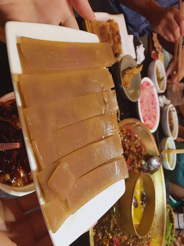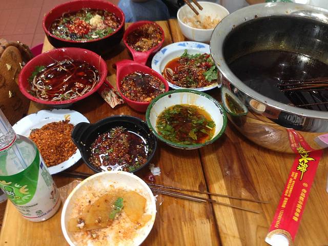 马上奔赴冒椒火辣。因为冒椒火辣很出名,慕名而来的人不仅有外地人,还有很多本地人,我们到了之后已经排到77号了。。心好累。。门口有很多卖小吃的,我们买了冰粉凉虾和蛋烘糕,蛋烘糕可以加跟多配料,我们要了一个炼乳蓝莓,一个老干妈肉松,事实证明还是老干妈肉松好吃,2.5元/个,有点可惜买少了,剩下的景点卖蛋烘糕价格都在3元以上。排了两个小时终于吃上了,串串我们没点多少,就要了点南瓜土豆金针菇豆皮竹笋,特色菜我们全点了。。没错,是全点了,都是一小份一小份的,火锅粉、鹌鹑蛋、兔腰、脑花、毛肚、牙尖口口脆,能要的全要了,还有必备的豆奶,点多了是肯定的,脑花很好吃,兔腰怪怪的,我喜欢吃毛肚,所有的菜都是一个颜色,超级红,吃到一半的时候我就受不了了,嘴里就跟要喷火一样,非常辣。到最后吃完我已经有点晕了,人家说是辣过劲了。结账才花了100元,很划算,毕竟我俩点的真心不少。