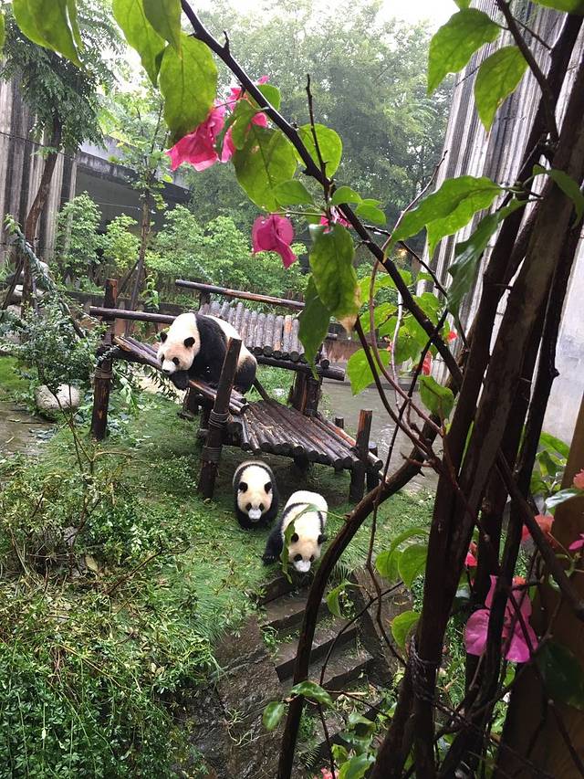 看了很多游记都说要早上早点去看胖达 ,所以我们早上6点多就出发了,先去吃了个早餐,一份鸡杂米线一份肥肠粉,哇塞肥肠粉实在是太好吃了,虽然吃完之后我又被辣的有点晕,但是真是很好吃,从我们住的地方到大熊猫基地大概要一个小时,早上开始下中雨,我们俩都很担心今天胖达因为下雨会不出来,8点5分时候到了目的地,买了门票,这时候还没什么人,进去直行大概50米就是坐电瓶车的地方,10块钱往返,相信我,前两天暴走之后,我们是没力气再走进去了,而且怕走进去了胖达也睡了,所以果断选择了电瓶车。熊猫最多的地方叫月亮产房,跟正门就是完全相反的地方,这也是我们选择电瓶车的原因之二。车很快就到了,我们的运气真心很好,今天在外面活动的胖达超级多!!大家的手机和相机都没停下来过,一直在拍,还有好多外国人,果然胖达是世界级萌宠啊。月亮产房出来之后坐上电瓶车到太阳产房,这里有好多幼年大熊猫,小小的一只简直要Q死了,基本在场的女性全都母爱泛滥了,这两个产房逛完了之后一定要去看小熊猫,小熊猫不是大熊猫的小时候,大熊猫小时候叫幼年大熊猫,这是完全不同的概念,还好我提前做了功课,没有丢人。小熊猫没有大熊猫多,所以看了一会就去大熊猫别墅看胖达了~之后就是天鹅湖,黑天鹅完全都不怕人的,他们会游到离你超级近的地方,然后就是礼品中心了,这里的东西其实都很贵,但是没办法,看着就想买,很可爱的。