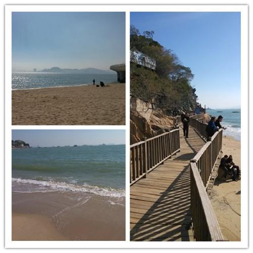 海滩边闲逛一阵,发一会儿呆,本来海边是有一条木栈道可以步行观光的,但正好在修,所以无奈只能沿着路边走,风光就没有那么好。这里的海滩在夏天都是海滨浴场,可以下海游泳,但天气关系大家还是选择踏浪或者晒晒太阳神马的,也是非常悠闲滴,这里的沙子比鼓浪屿上的更干更软更细,所以沙子进到鞋子里也是没有办法的啦,沙沙的感觉也是别有一番味道嘛。波光粼粼、惊涛拍岸、阳光明媚、心情自然也就好起来了,羡慕厦门人,心情不好了来海边发发呆,再烦心的事情也都走光光啦!想到了那首歌:如果大海能够,带走我的哀愁……(喂)