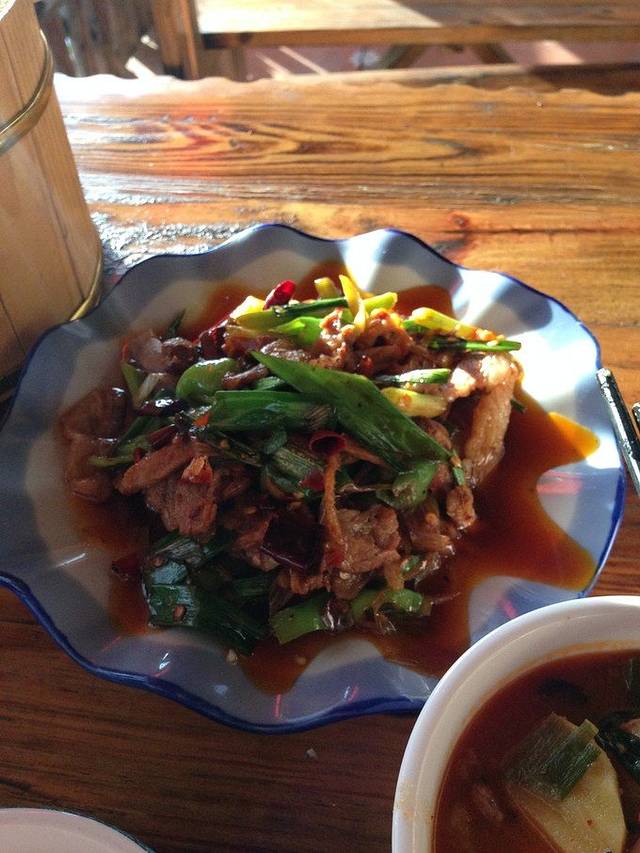 客栈周围唯一的一家餐馆里凑合吃一顿!不过位置和环镜都挺不错的,就在洱海边上,可以一边欣赏洱海风景,一边用餐,餐馆老板挺不错的,很热情的和我聊天,还把自家晚饭的菜端了一份过来给我品尝,不过这个土豆烧的猪大肠味道的确怪怪的,听说用了很多当地的土调料!