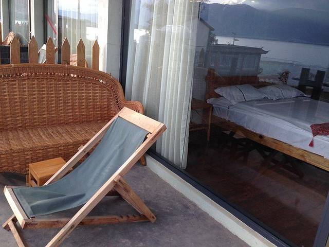 这个客栈的房间挺很大的,很大一扇落地玻璃,躺在床上就能看见海景,房间外的阳台不算是很大,但是摆放了一张长条的藤椅和两根长椅,可以几个人一起在阳台上看海景!这个价格的海景房估计整个大理也没几家!