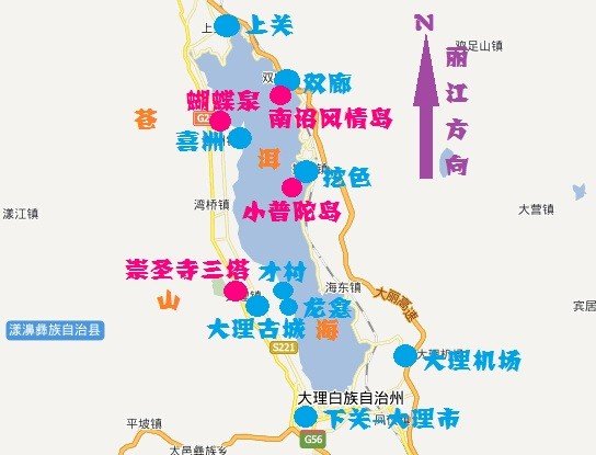 这回主要目的地是洱海,所以给大家先看看洱海的地图,以及其中的重要景点!除了崇圣三塔以外,这回洱海一圈几乎都去了!