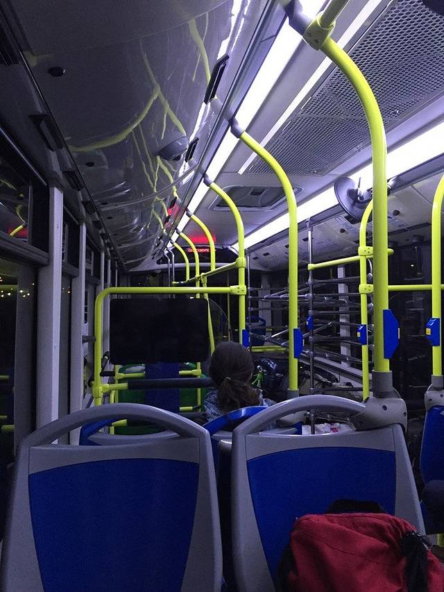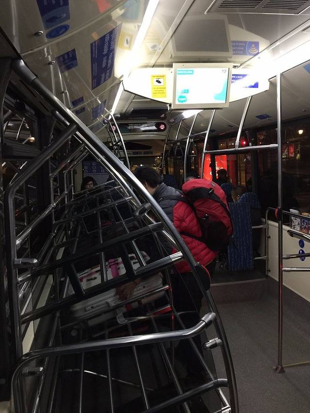 我们选择了机场快线,就从到达大厅出去,往右边方向走,会看到一个不起眼的公交站牌,就在那里等车。车票钱直接交给司机即可,最好准备好零钱,不要太大面值。机场快线还蛮像公交车的。