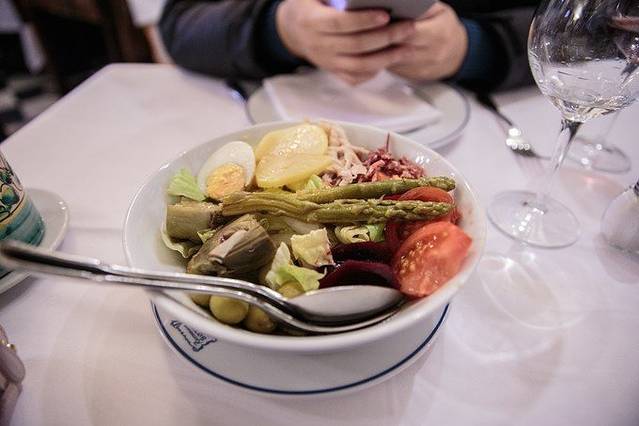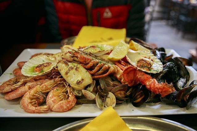 市场边缘都是小餐馆大牌档,都是吃海鲜烧烤的,最后选了一家小店,店员很热情就进来了。他家不含龙虾的海鲜拼盘是40欧左右,含龙虾的海鲜拼盘是55欧。