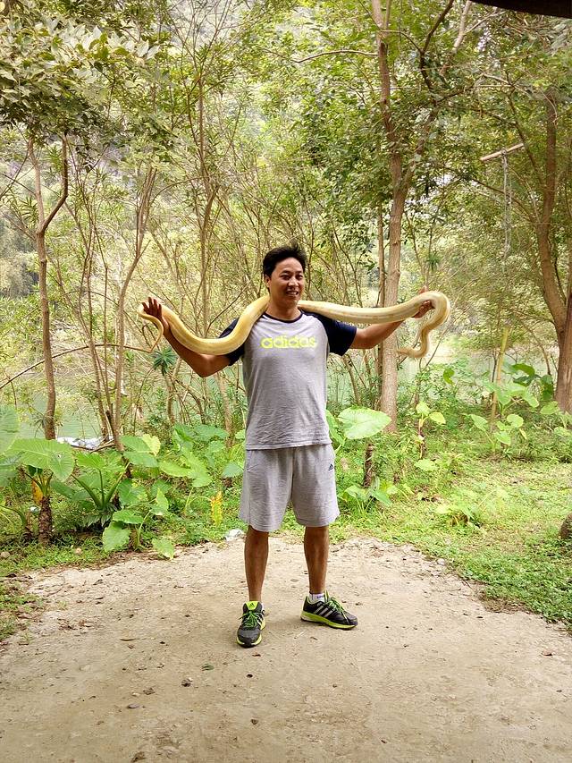 中途到一个景点,停下来上岸,拍照。这位大哥果然很牛,巨蟒啊!