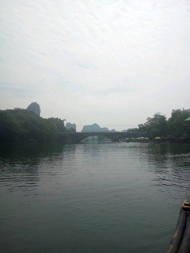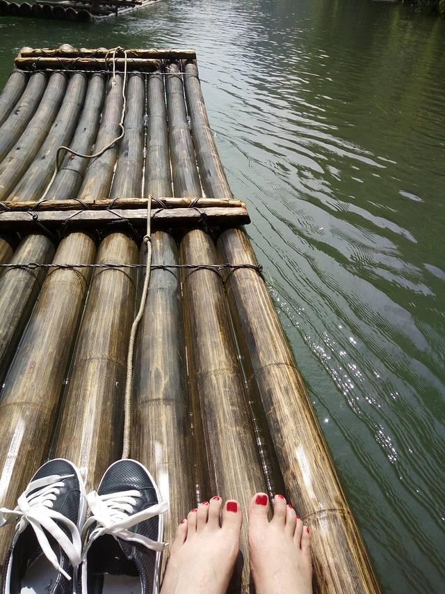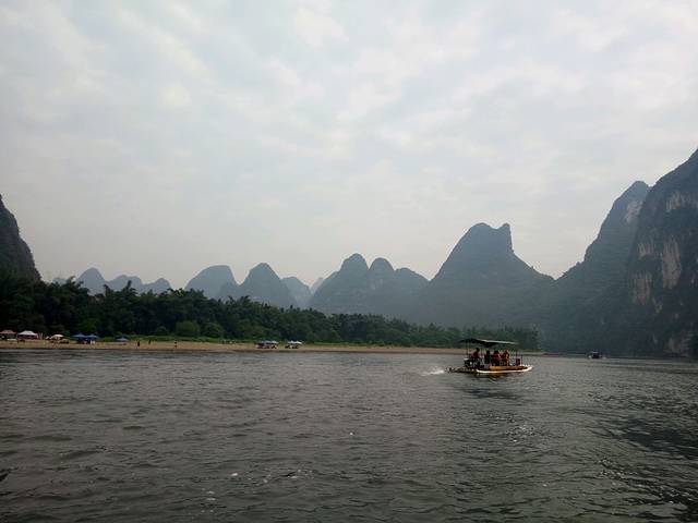 漓江漂流,果然全程马达声轰隆隆,破坏意境,还必须穿救生衣。而且很快,一个筏上四个人,120每人,一个小时左右,开到头,筏工会问还要往上游去吗,四个人150哦,比外面单买便宜很多,但我们觉得也就那样了反正,然后就回程了。