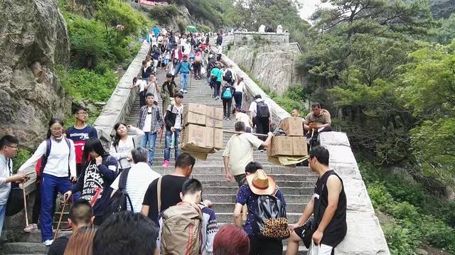 4、由于是假期,夜爬泰山的人很多,几乎是一个人跟着一个人的后脚跟走的,其实旁边的人已经照亮了你的路。不过如果想要安心一点,可以买一个小手电筒。至于登山棍,除非体力很弱的人,不然没什么必要。