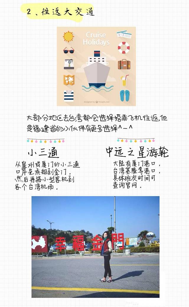 从厦门搭乘小三通联运是性价比极高的,客轮行至金门,接驳巴士直接拉至机场直飞台湾,沿途还可以感受下金门的宁静气息。总时长不超过3小时,网络上售价2000元不等。