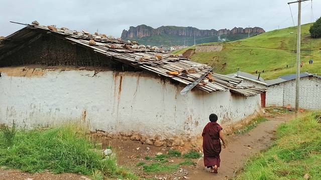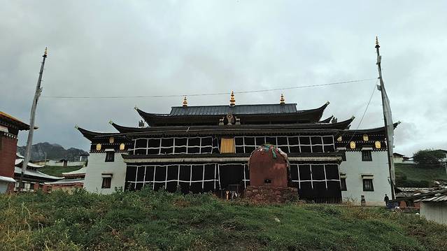 南岸的四川苯钵教格尔底寺,寺院多为白墙,琉璃为顶,端庄肃穆中透着几分古朴。