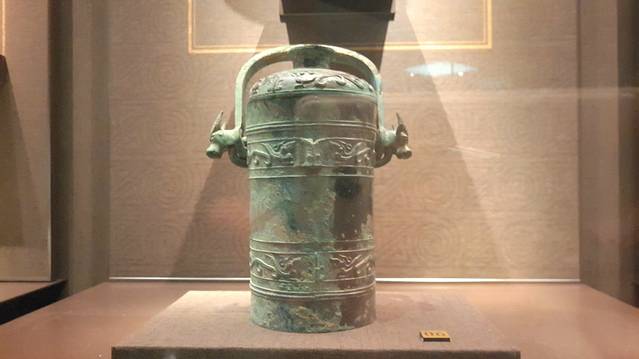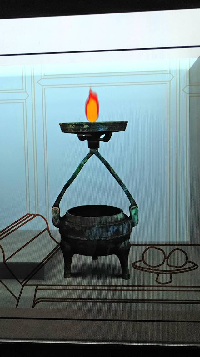 鼎形铜行灯。战国文物,可以打开收合,按键可以自动演示起过程,很神奇。