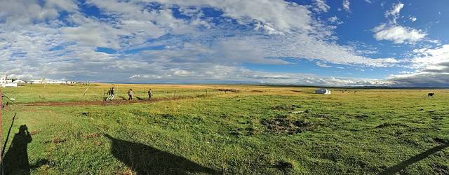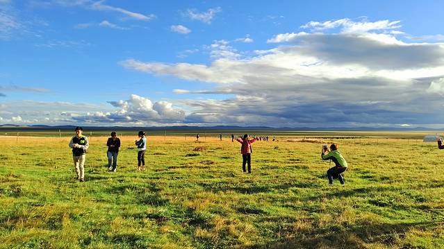 不断地要求停车,导游说给我们找到最好看的地方。在大家的央求下,车子终于在路边停下了。20多号人一窝蜂地跑到草地里开始撒欢儿