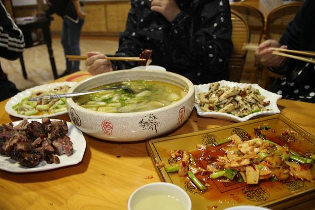 我们中午12点出发,约6:40下高速,中间在服务区休息、用餐耽误约一个半小时。之后沿209国道直奔木鱼镇,但是实在人困马乏,又累又饿,8:30到红坪镇时决定先用晚餐,等候时看这里游客不多,环境好,又安静,决定就住在这里,明天直接去景区神农架。找好住处去用晚餐,我们点的排骨火锅,两份素菜,他们的土豆和豆腐很好吃,火锅汤底用的是鸡汤,汤的味道很浓,每个人都喝了几碗,一天的奔波劳累已然去了大半。