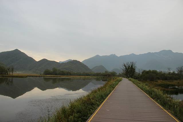 中午1:30到大九湖镇用午餐,味道一般化。2:30到景区入口处买观光车票进去景区,观光车25分钟后换乘小火车,这里最好的景色是晨雾和晚霞,可惜今天天气不好,看不到晚霞。停靠站依次为No2:4号湖;NO3:摇钱树,NO4:5号湖,NO5:狮子包,狮子包景点有7.8.9号湖。我们因为时间的原因,直接坐小火车到终点狮子包,(沿路看看哪些景色值得一看,返程时再下车观赏)到里面游玩7.8.9号湖,及唐朝古墓,落水口,据景区工作人员介绍,这里20多天没有下雨的原因,水不好,感觉景色一般。不耽误时间的话,全程大约1个半小时,出来时乘坐最后一趟小火车返回,6点出发,大约10分钟到4号湖,这里真的很美,沿栈道前行,左侧的景色如同水墨画,安静祥和,右侧的如同油画,色彩斑斓,风格不同,但是相得益彰,毫无违和,尽头处有供游客休息的亭子,从这里看远处炊烟袅袅,近处水草相映,水墨画与油画完美融合,令人久久不忍离去。可是时间有限,7:15分乘坐景区大巴离开时天色已黑(6点是最后一趟小火车,6:30分开始发大巴车,一小时一趟,末班车8:30)8.45分直接出景区,不用再换乘,取车前往木鱼镇.